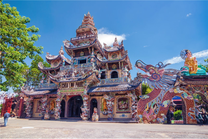 Chùa Linh Phước hay còn được biết đến với tên gọi khác là chùa Ve Chai. Chùa nằm ở vùng ngoại ô, cách trung tâm khoảng 8km. Địa điểm này không ít lần gây “bão” trên các trang mạng xã hội với những tấm hình check in đầy nghệ thuật của các tín đồ sống ảo. Cũng nhờ đó mà ngôi chùa ngày càng nổi tiếng và hấp dẫn nhiều du khách thập phương ghé thăm. Điểm nhấn độc đáo của chùa Linh Phước ở Đà Lạt là các công trình trong khuôn viên chùa được khảm các mảnh sành, sứ, chai bên ngoài. Do đó, ngôi chùa này còn được gọi với cái tên khác là chùa Ve Chai. Chùa có diện tích 6.666,84m2, chánh điện chùa rộng 12m, dài 33m với 2 hàng cột rồng khảm sành. Đây cũng là ngôi chùa duy nhất ở Việt Nam sở hữu đến 11 kỷ lục.
