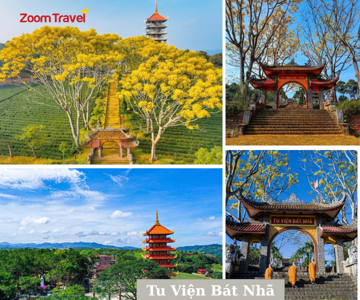 Tiếp tục hành trình là Tu Viện Bát Nhã, nổi tiếng với hàng nghìn tán cây phượng vàng hoe cả góc trời. Nơi đây được bao bọc xung quanh là những đồi chè, những rừng thông bạt ngát tươi xanh. Phía dưới của Tu viện Bát Nhã là 3 thác nước hùng vĩ, chảy “ầm ầm” quanh năm.
