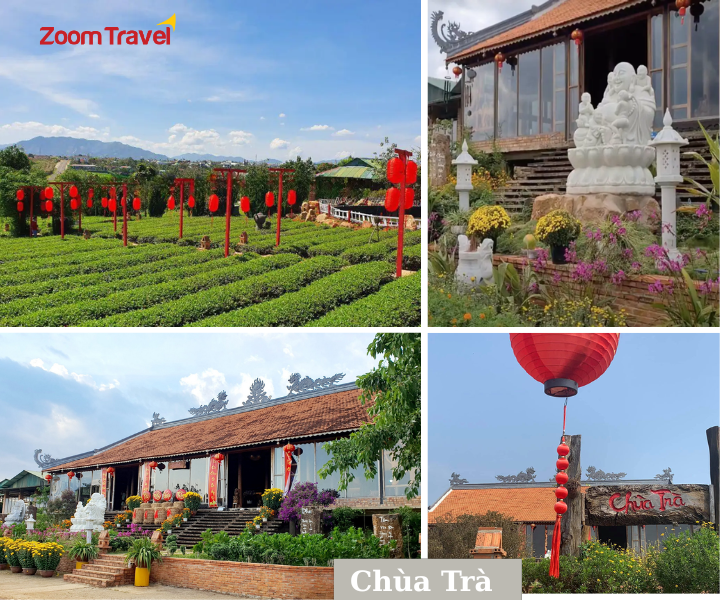 Sáng: Quý khách dùng điểm tâm sáng. Sau đó, xe đưa khách đến với Chùa Trà - Ngôi chùa được đặt tên theo loài cây là biểu tượng đặc trưng của vùng đất và con người xứ cao nguyên Di Linh chín là cây trà. Không bề thế đồ sộ như các ngôi chùa khác tại Bảo lộc, chùa Trà khoác riêng cho mình chiếc áo vô cùng mộc mạc và bình dị. Được xây dựng giữa cánh đồng chè bát ngát nên khi đến đây du khách có thể đắm chìm vào rừng thửa ruộng chè xanh tươi mát.