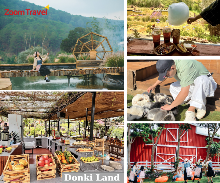 10h00: Xe và HDV đưa đoàn đến Donki Land - được lấy cảm hứng từ phong cách Trung Cổ Châu Âu nên tất cả các tiểu cảnh và cách bày trí tại đây sẽ mang đến cho bạn phong cảnh làng quê Châu Âu yên bình, xinh đẹp. Từ cối xay gió, ngôi nhà Hà Lan, cánh đồng hoa đủ sắc màu đến hồ nước thơ mộng: Cẩm tú cầu, lavender Thái, Cỏ hồng... Ngoài ra quý khách có thể trải nghiệm trượt cỏ!