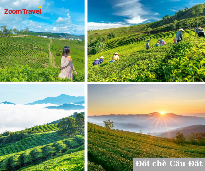 07h30: Đoàn khởi hành tham quan Đồi Chè Cầu Đất với những hàng chè hiện ra trong khung cảnh thiên nhiên hài hòa giữa màu xanh dương của đám mây kết hợp với hình ảnh núi đồi rợp lên một màu xanh lá cây trải dài từ dãy này qua dãy khác, cùng với những chú chim bay lượn trên cao tạo nên một bức tranh phong cảnh đẹp tuyệt vời.