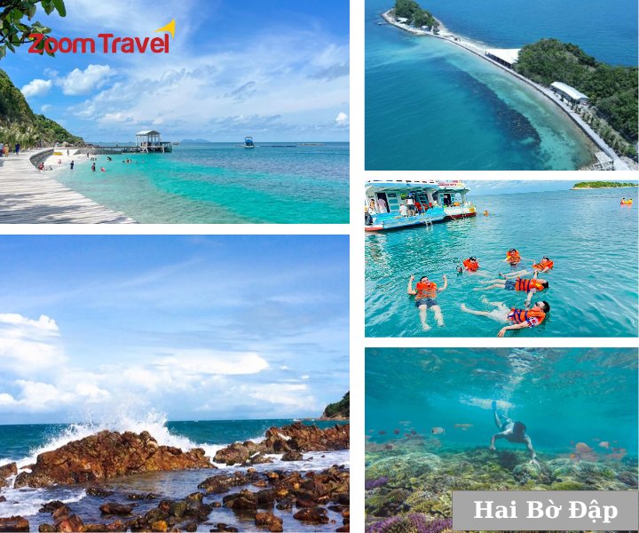 - Tiếp tục tàu đưa quý khách đến hòn Hai Bờ Đập, check in địa điểm hot nhất gần đây được mệnh danh là Maldives thu nhỏ của trời Nam với phong cảnh hoang sơ, ở đây tất cả như hòa quyện vào nhau tạo nên một bức tranh sơn thủy tuyệt mỹ. Quý khách tự do tắm biển, câu cá, lặn ngắm san hô.